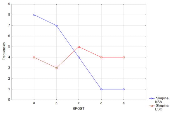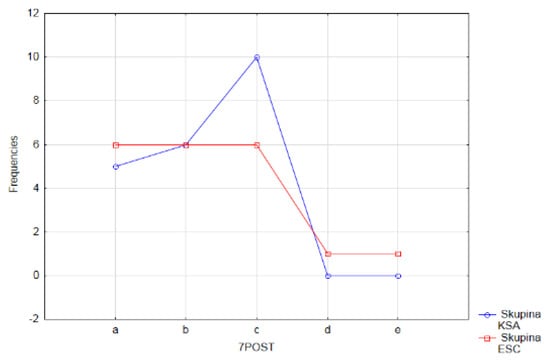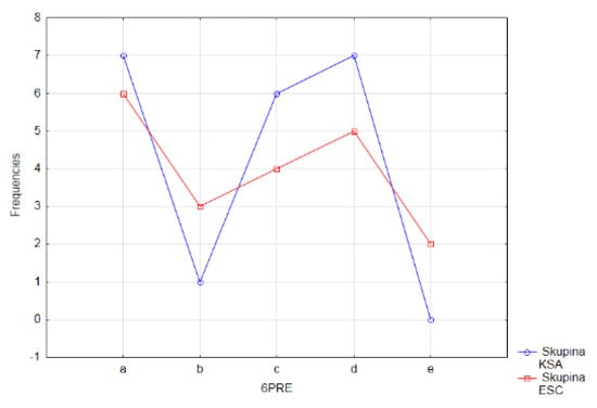 In the control group of the pupils (KSA) the most frequently chosen answer in the sixth questionnaire item in the posttest (38%) was the answer a—I am interested in mathematics because it helps me to get to know and understand many things (Figure 18). This result confirms the pupils’ higher level of general intelligence in this group, which is also documented by the fact that the control group (KSA) of students shows better study results on average, has higher general study prerequisites and abilities, and interest in learning compared to the pupils of the experimental group (ESC). One-third of the pupils (33%) chose answer b as the reason that most often encourages them to learn mathematics—I am interested in the teaching aids we work with in the mathematics lessons. We recorded this second, most common choice of answer in the control group of pupils (KSA), despite the fact that the interpretation of the curriculum in this group took place in a conventional way and the teacher used the teaching aids he had at his disposal.