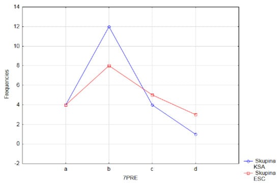 The results of the statistical analysis of the answers to the seventh questionnaire item obtained before the pedagogical experiment (Figure 16) show that the pupils in both groups are most comfortable when the teacher explains the new curriculum (subject matter) all by himself, using various teaching aids (answer b). The order of the answers determined by their descending number in the control and experimental group of pupils is the same, namely b–c–a–d, which does not match the results recorded in both groups of the respondents (ESC, KSA) in the posttest (Figure 19).