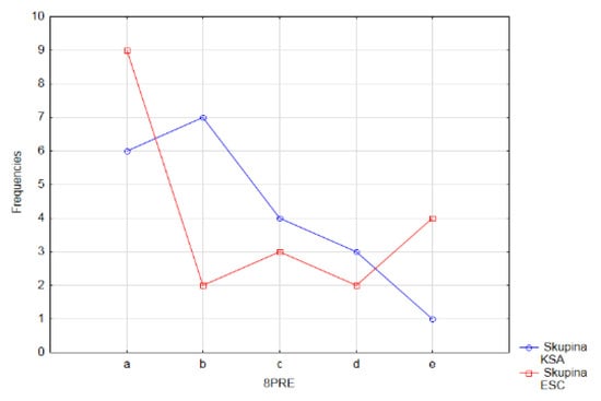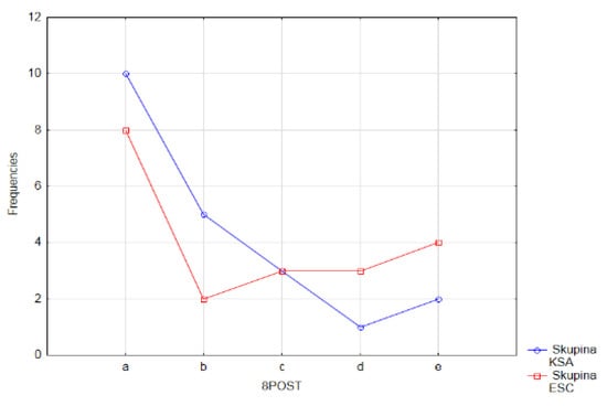 As it can be seen from the graphs presented in Figure 17, in the experimental group of the respondents (ESC) the most frequent answer in the pretest was option a—I am not afraid or anxious about anything, which was chosen by 45% of the respondents. Most pupils, namely 33.3%, in the control group (KSA) opted for answer b –unpreparedness for the lesson (I do not have my homework, I do not have the necessary tools). It can be seen from the graphic visualization of the results that in the experimental and control groups of the pupils the order of frequency of the answers in the first two and the last position differ. The order of the answers of the pupils of the control group was b–a–c–d–e, in descending order, and the order of the frequency of the answers of the pupils in the experimental group is a–e–c–d–b. When choosing answers b—unpreparedness for the lesson (I do not have my homework, I do not have the necessary tools), and d—a quick test, the same value of its number was recorded in the experimental group of pupils, namely 2 (Figure 17). It is also worth noting that the fear of math lessons from getting a bad mark (answer e) was chosen by only one pupil in the control group out of the total number of 21 respondents, which we perceive as positive information.