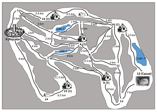 In the medieval game “Legends of Al-Bufera”, the player Elner finds himself in the village Rojcatar with a loot of 500 points, a map, and his mare Velatina. In Figure 2, it can be seen that the mentioned map includes the villages Rojcatar and Casue, different isolated houses and inns (labeled as I), and the kilometers separating them from each other.