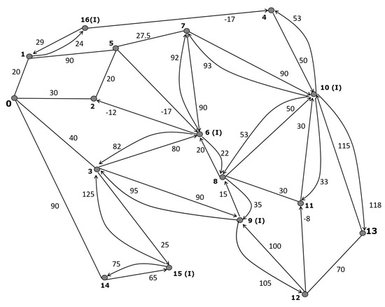 We ask the students to observe that the final weight associated with each arc of the graph can be either positive or negative. From the above considerations, the students must construct the matrix of weights (points) C associated with the graph G (see Figure 3) shown below.
