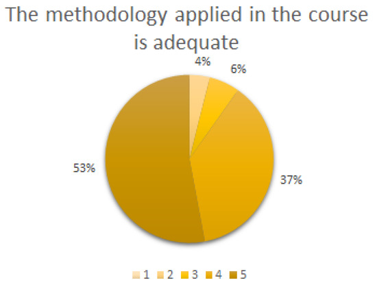Figure 5 shows that more than half of the students (53%) considered the methodology used in the course very appropriate and 37% of them considered it quite proper.