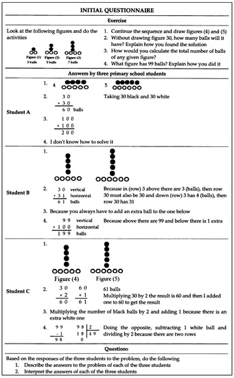 The research data were collected at two different times of the teaching test: initial stage (initial questionnaire, session 3) and final stage (final questionnaire, session 7). At the initial moment, the PPTs only had information on the strategies for solving the problems of pattern generalization, while at the final moment, the PPTs analyzed the responses of three other students to a second problem of pattern generalization, based on the information received in the teaching module.