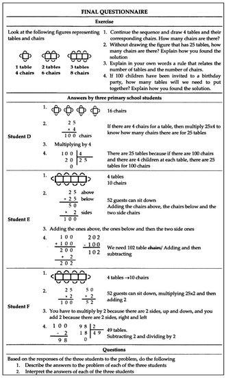 The data collected at the final moment are the PPTs’ responses to the final questionnaire proposed in the last session, in which the responses of three other primary students are shown. The final questionnaire, similar to the initial questionnaire, consists of a problem defined by the affinity function f(n) = 2n + 2, and the two same professional issues (Figure 3).
