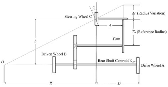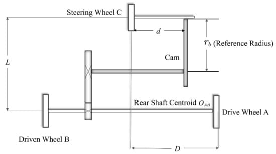 As shown in Figure 1, the drive wheel A is the movement rule input, which is transmitted to the cam through the drive mechanism, a set of gears; the steering wheel C is the steering motion output, and the final motion trajectory is the movement output. In Figure 1, the drive wheel A and the driving wheel B are installed on the rear shaft while the steering wheel C is perpendicular to this shaft; the horizontal distance between each of these rear wheels and the steering wheel C is D. The gear set is on the side of drive wheel A, and the cam and steering rod are on the side of driving wheel B. When this device moves straight forward, the steering rod axis is parallel with the rear shaft axis and the vertical distance is L; then, the radius of the corresponding cam curve is the reference radius , and the steering wheel C is parallel to the cam with a distance of d. The device parameters when moving straight forward are as shown in Table 1.