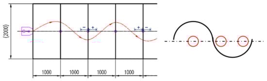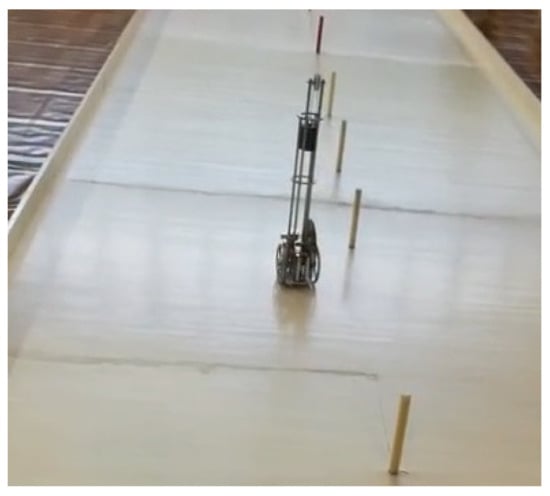 After adjustment, the scenario is simulated as required (Figure 14). The obstacles are plastic round bars of 20 mm diameter and 200 mm height, one obstacle is placed at each odd position and one obstacle at each of the even position +300 mm and −300 mm limits. The device is required to go around the right side of the obstacles at the odd position and the left side at the even position, without touching them or passing between the two adjacent obstacles at even positions. During the test, the device completed the required operation of the pre-set trajectory without touching any obstacle in 10 periods.