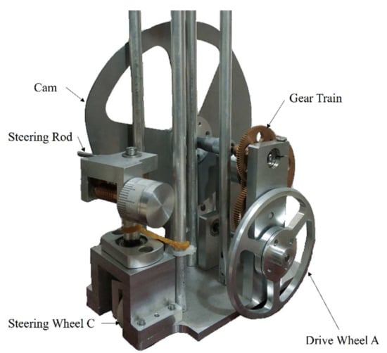 Substituting Equation (15) into Equation (9) yields the length of a period, 2189.0270 mm. Based on the pre-set gear ratio , the cam rotated a whole circle and drive wheel A travelled a distance of , then the diameter of drive wheel A can be obtained .
