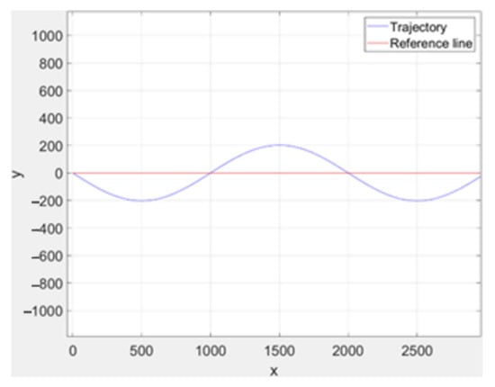 It can be seen in Figure 11 that the amplitude of the actual trajectory is larger than the amplitude of the ideal trajectory, and the actual period is longer than 2000 mm. According to the simulation results, it is caused by the steering angle being too large and the micro-indexing head can be used to reduce this error. Moreover, to keep the general direction straight, the worm should be used to turn the steering wheel slightly to the right while reducing the rotation angles. After adjustment, the measurement is still performed as aforementioned (Figure 12) and recorded in Table A2 (Appendix A). It can be seen in Figure 13 that the adjustment has moved both the period length and the amplitude substantially closer to the ideal trajectory.