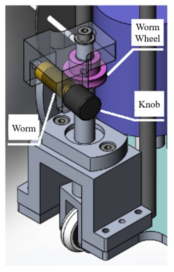 Take the deviation of , for example, i.e., , to perform the design. The fine-tuning mechanism under this index value is very precise. Considering there is friction between the steering wheel and the ground and between the steering parts during the driving process, the fine-tuning mechanism is supposed to have a self-locking feature. In the meantime, it should be convenient to adjust, so the worm is chosen. The specific design is shown in Figure 7: the worm wheel is fixed on the steering shaft cooperated with the worm, and there is an adjustment knob with scales installed on the side of the steering shaft, which can drive the worm to rotate by turning manually; then the worm drives the worm wheel to realise the left or right fine-tuning of the steering wheel.