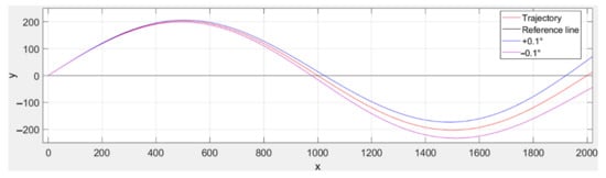 For the first type of error, “errors that cause uneven distribution of the steering’s left and right rotation angles”, the designed worm mechanism can eliminate the error by directly finely adjusting the steering wheel’s left and right rotation angle distribution. From Figure 9, it can be seen that when the first half-period length of the trajectory is larger than the second half-period length, the trajectory is skewed to the left (distribution +0.1°); when the first half-period length of the trajectory is smaller than the second half-period length, the trajectory is skewed to the right (distribution −0.1°).