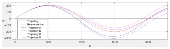 For the second type of error, “errors that make the sum of the steering wheel rotation angles too large or too small”, in addition to the direct adjustment of the active length of the steering rod using the micro-indexing head, indirect compensation can also be made through the worm, especially when the deviation is no larger than (Figure 10). When the steering amplitude increases, the trajectory has a tendency to deviate to the right (Trajectory A, amplitude +1.7°), and the steering wheel needs to be fine-tuned to the left (Trajectory B, amplitude +1.7°, distribution +0.1°). Similarly, when the rotation amplitude decreases, the trajectory has a tendency to deviate to the left (Trajectory C, amplitude +1.7°), and the steering wheel needs to be fine-tuned to the right (Trajectory D, amplitude −1.0°, distribution −0.1°). The simulation results show that the fine-tuning device can compensate for the errors that occur in machining and assembly and ensure that the device travels on the pre-set trajectory.