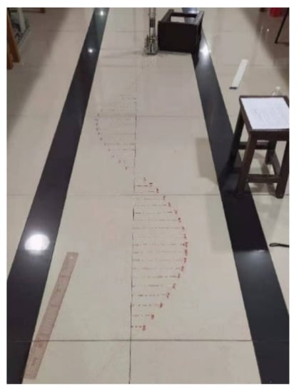 With this as the basis for the test, the experiment plan is designed as follows. A prototype is manufactured and assembled according to the values in Table 2. A 1 kg standard weight (Φ 50 × 65 mm, made of carbon steel) is suspended on the device as the power source, and the drop height of the weight is 400 ± 2 mm. The standard weight is always carried by the trolley and does not fall from it. The weight is lowered by a rope that drives the drive wheel. An ink-dropping device is also suspended on the device to record the actual trajectory. Based on the length of one period of the actual operation of the experimental device, this period was measured in 40 equal parts, and the first measurement results are listed in Table A1 (Appendix A).