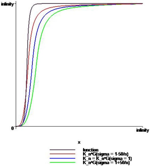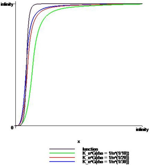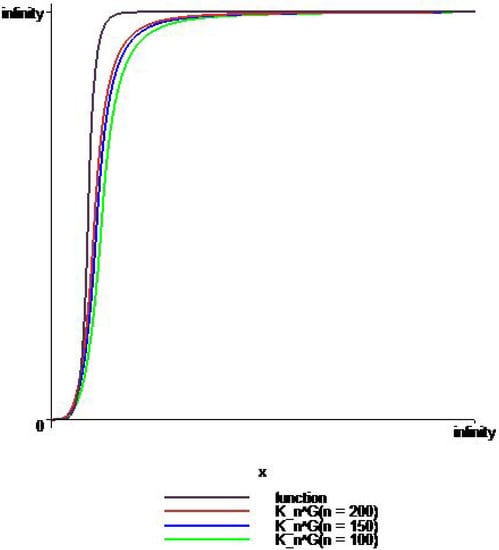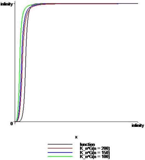 In Figure 2, we compare the approximation of to on for increasing value of n by choosing , such that ; i.e., and . Similarly, we see that the approximation of the operator becomes better for increasing value of n.