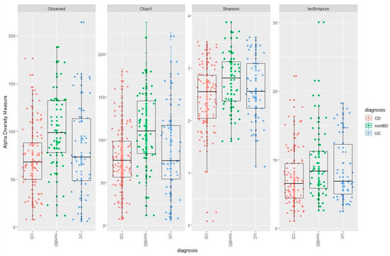 Comparison of α diversity measured by observed species, Chao1 index, Shannon diversity, and Simpson (from left to right). CD cluster is shown in red, UC in blue, and non-IBD subjects in green. Healthy control samples are significantly different from IBD samples. Shannon and Simpson indicate the uniformity of the abundance of different species in a sample. Figure generated using RStudio.