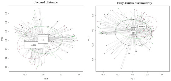 Beta diversity for the IBD dataset. Jaccard distance vs. Bray–Curtis dissimilarity. Once β diversity has been measured, the dataset can be visualised by principal coordinate analysis (PCoA). PCoA is an ordination technique widely described in the literature for analysing the composition of different microbiomes. β diversity analysis elucidate dissimilarities between samples (UC, CD and healthy). Figure generated using R.