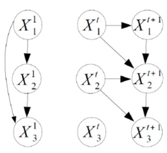 Example of a DBN structure. Prior BN (left) and transition BN (right) for three variables.