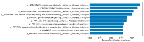 Feature importance (metatranscriptomics data) with a RF. Only the first ten features are shown for illustrative purposes. Generated with a Python script.