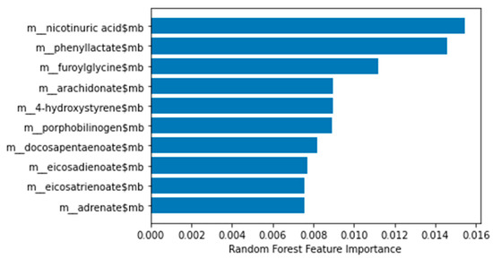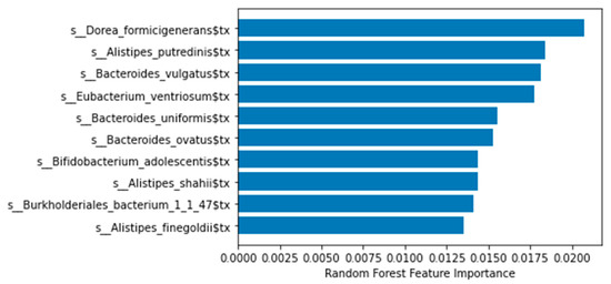 Feature importance (metagenomic data) with a RF. Only the first ten features are shown for illustrative purposes. Generated with a Python script.