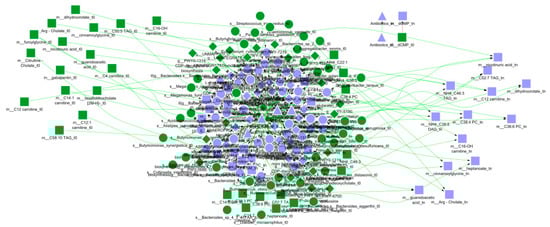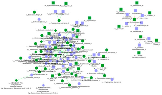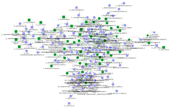 The pre-processing steps, implemented through our ad-hoc script, involved filtering subjects with limited time points, integrating three omic types in one matrix, normalisation, and feature selection (see Section 2). Feature importance was computed for each omic data type (Figure 4, Figure 5 and Figure 6). Based on these pre-processing steps, the resulting dataset used for modelling consisted of 91 subjects, 200 microbial taxa, 200 expressed metabolic pathways, and 200 metabolites. As clinical variables, the week in which the sample was obtained, and the use or not (binary) of antibiotics was included. In addition, the Bayes factor score was used to further reduce the dataset. Prior biological knowledge was used as input to the DBN learning algorithm in order to constrain (arcs between nodes, arc directions, and strength) the resulting output model and prevent overfitting.