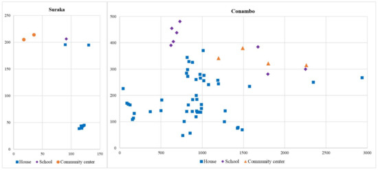 The two communities studied were Suraka (2°02′21″ S–76°21′29″ W) and Conambo (2°00′22″ S–76°27′08″ W) (Figure 2). Both have similar standards of living, access to basic services and cultural characteristics. Regarding basic services, neither of them has access to drinking water, sewage systems or electricity. Suraka had 12 demand points: nine houses, two community centers and one school. In contrast, Conambo is a particularly large community, with 61 demand points: 49 houses, 8 school classrooms and 4 community centers (i.e., one meeting room, two dining rooms and one waiting room). Finally, according to the project promoters, wind turbines were not considered for the Amazon communities because of this technology’s negative environmental impact (mainly, tree felling).
