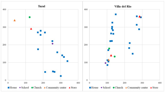The communities studied were Tuzal (16°42′11″ N–93°55′02″ W) and Villa del Rio (16°44′42″ N–93°55′13″ W) (Figure 3), located in the state of Chiapas. This state is in the south of the country and has the lowest HDI: 0.667; there are approximately 6000 communities without access to electricity [41]. Tuzal is 90 km from the regional capital and had 14 houses, 1 school, 1 community center, 1 store and 1 church. None of the houses have drinking water; therefore, it must be carried from a nearby well. Access to this community is difficult because of the mountainous relief. Villa del Rio is 100 km from the regional capital and had 20 houses, 1 school, 1 community center, 2 stores and 2 churches. Access to the community is also difficult because of the mountainous relief and dirt roads.