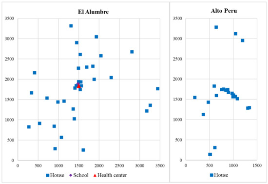 The two studied communities were El Alumbre (6°52′57″ S–78°26′23″ W) and Alto Peru (6°54′25″ S–78°37′24″ W) (Figure 4). The former had 33 houses, 1 school and 1 health center, widely dispersed. Alto Peru had 26 houses, 50% of them concentrated in 30% of the territory. The wind resource in both communities was variable; in some parts of the community, the wind resource was high, while other parts had low to moderate wind resource. The solar resource was highly significant, constant and the same for both communities.