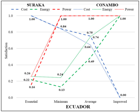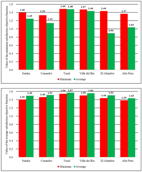 As shown in Figure 6, logically, the minimum satisfaction solutions (red bars) in the top image are higher than the average satisfaction solutions (green bars) for all of the communities; the opposite occurs in the bottom image. However, the differences between bar sizes were significantly higher for the minimum satisfaction objective function (top) than for the average satisfaction objective function (bottom). For instance, in Conambo the difference was 0.19 for the minimum satisfaction objective function (1.33 vs. 1.14), while it was only 0.05 for the average satisfaction objective function (1.46 vs. 1.51). In El Alumbre, the differences were even higher: 0.54 (1.44 vs. 0.90) and 0.07 (1.44 vs. 1.51), respectively. Consequently, the average satisfaction solutions logically obtained top values for their objective function (1’), but their performance on the minimum satisfaction objective function (1) was limited. In contrast, the minimum satisfaction solutions are more recommendable, since they logically obtained the top values in their objective function (1) and, in addition, they achieved close-to-top values in terms of the average satisfaction objective function (1’).