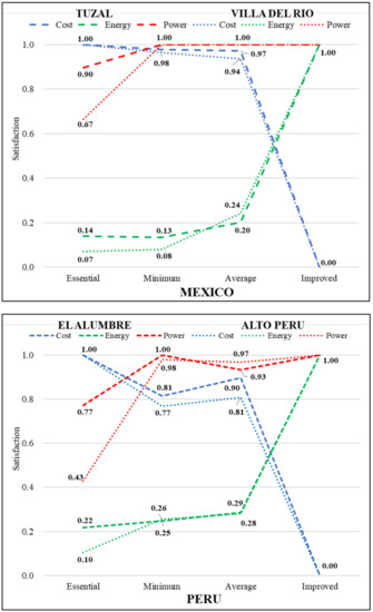 It is also worth noting that, in all of the Ecuadorian and Mexican communities, the average satisfaction assumption showed results with an energy satisfaction and equal peak power satisfaction similar to the minimum satisfaction assumption, but the average assumption solutions had a higher cost. In contrast, the Peruvian communities showed the opposite situation. Therefore, the comparison between these two modeling assumptions is not straightforward and is further examined in Section 5.2.