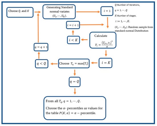 In detail, the Type I error values were computed with various values and sample sizes. The first case was with and the sample size equals . We noticed that the initial values for the Type I error with were between 0.0499 and 0.0503. The critical values monotonically decreased, whereas the number of increased, such that when the the Type I error values were between 0.0415 and 0.0438, which is less than 0.05, which means it is an acceptable error, and better than the error in the original procedures.