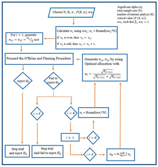 Since group sequential testing procedures became widely used in medical experiments. The procedures were crucial to be developed by researchers to generalize and modify procedures for varying circumstances. By way of example, Maurer and Bretz developed a class of group-sequential-weighted Bonferroni procedures with multiple endpoints, for which the correlations of sequential statistics are used. Consequently, the power was increased, while the family-wise error rate was effectively controlled []. On the other hand, Yiyong Fu presented follow-up work to Maurer and Bretz, proposing a Holm-type step-down exact parametric procedure for situations in which correlations are unknown. Further, he briefly outlined an extension of the partially parametric Seneta–Chen method that is naturally a group sequential design []. Zhenming Shun examined an approach that combined sample size re-estimation, a negative stop (stochastic curtailment), and group sequential analysis in a single interim analysis conducted with normal data [].