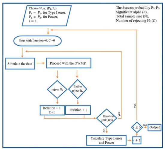 In each case of , the subsamples are generated from two different binomial distributions with different to make sure that the alternative hypothesis is true. Then, the OWMP was used to examine if (that there is a difference between the two groups) is rejected, or a significant difference is found and is accepted. After repeating this 500,000 times, the proportion of accepting is computed, and this is the power rate (because was assured to be true). The process of computing the power is illustrated in Figure 3.