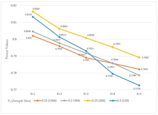 The power values with and were between 0.8010 and 0.8113. It was further found that by comparing the power results with the values of the power values monotonically decreased as values increased. However, the power values when were between 0.7840 and 0.7888 with marginal errors not more than 0.0160.