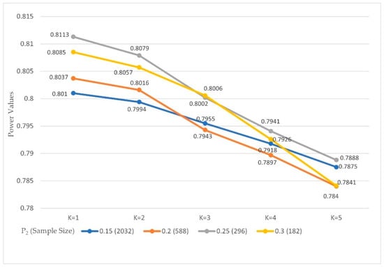 It was noticed that with the results for the power values with were between 0.8046 and 0.8164. Then, the values showed a decreased behavior when the values of were increased because the power values, when were between 0.7726 and 0.7892, with marginal errors not more than 0.0274 between the power values and the 0.8.