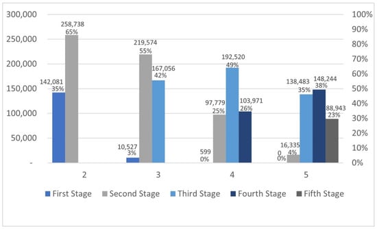 The rejections were calculated with a standard power value of 0.8, with the probabilities of success of and with and the sample size was . Table 7 and Figure 6 demonstrate the needed sample size and the number of rejections of occurring at stage with 500,000 iterations.