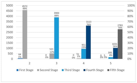 In addition, in 74% of the cases, the whole sample was not needed. At , the highest rejection percentage was 38%, with a 530 sample size, and the highest percentage was at the fourth stage. Rejection occurred in 77% of cases earlier in the process.
