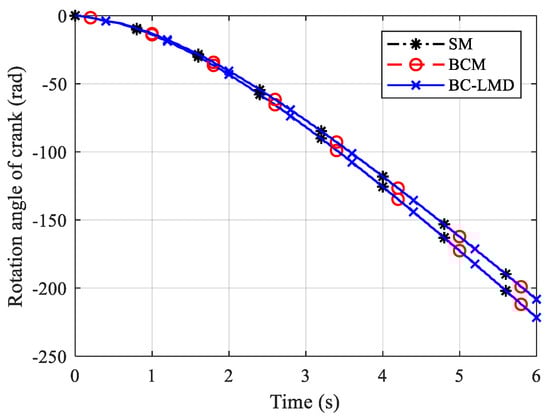 Figure 3 depicts the lower bound and upper bound for the rotation angle of the crank, in which a well agreement is present between the results obtained by SM, BCM, and BC-LMD. This was attributed to the monotonous property of the response of rotation angle of the crank. In this case, there was no phase difference that appeared in the sample responses; thus, the results obtained by the BCM and BC-LMD were consistent.