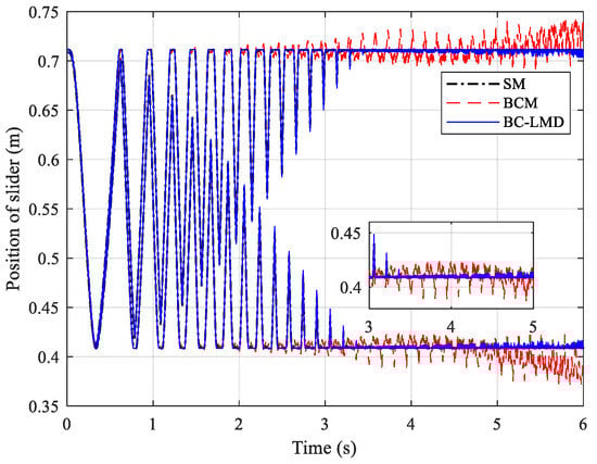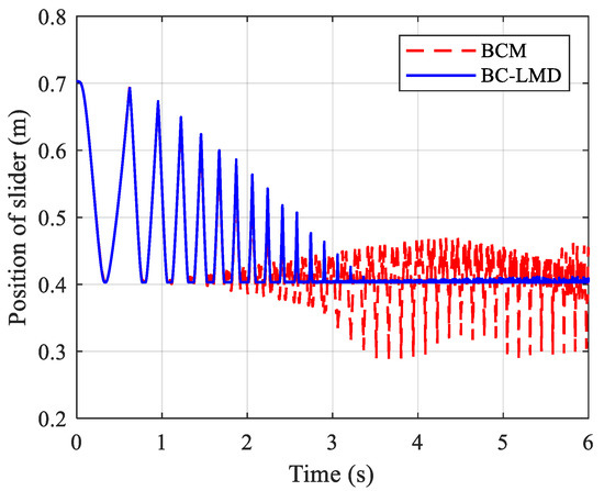 Bounds for position response of the slider are exhibited in Figure 5. A slight deterioration of the response bounds obtained by BCM can be observed, since t = 2 s and was aggravated with the increase of time history. After t = 5 s, the results from the BCM present overestimated response bounds compared with those from the SM and BC-LMD. Furthermore, the BC-LMD can envelope the position response of slider tightly with the increase of time history.