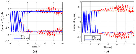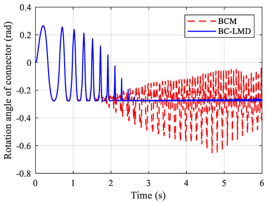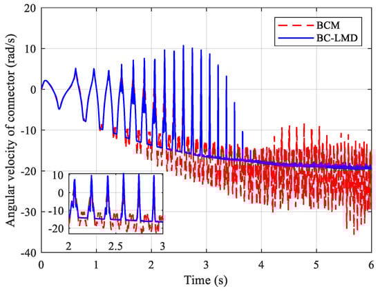 Figure 8 exhibits the lower bound of the angular velocity of the connector. It can be found, since t = 1 s, that the bound obtained by the BCM deteriorated and oscillated more and more intensively, which loses the meaning of reference. Compared with the results of the BCM, the BC-LMD can provide a tight bound and present desirable computational accuracy with the increase of time history.