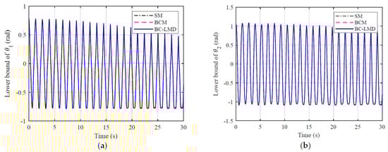 Lower bound of the double pendulum under a 1% uncertainty level: (a) lower bound of the rotation angle of the top rod; (b) lower bound of the rotation angle of the bottom rod.