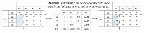 Step 4: Calculation of priorities between elements. For each cluster, only the non-zero components of the matrix will be considered. There are as many pairwise comparison matrices between elements associated with a network element as groups of elements belonging to the same cluster that influence that element. This influence is obtained by the conventional AHP method, using Saaty’s fundamental scale to complete the entries of the paired comparison matrices. Let us assume as an example that elements e2, e3, and e4, both belonging to cluster C1, have an influence on element e1 (Figure 1). A simple AHP model will be constructed to determine how much influence each of the three elements has on e1.