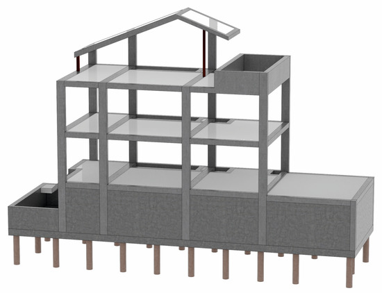 A baseline design (REF hereafter) will serve as the reference solution for the study (Figure 2). It consists of conventional 25 MPa reinforced concrete slabs and columns. The partition walls between dwellings and the facades are constructed with double brick sheets and mineral wool interior thermal insulation. The substructure comprises a deep foundation of drilled piles without shafts under foundation beams, using 35 MPa and 30 MPa concrete, respectively, due to the exposure environment.