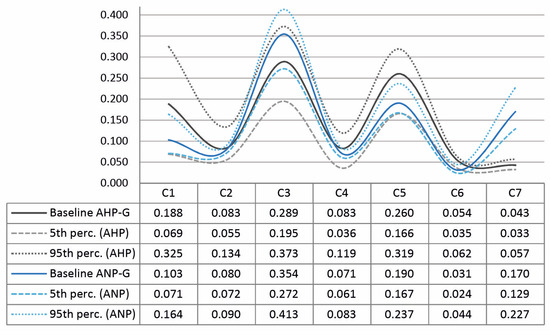 Comparison of the weights for the seven criteria determined through AHP and ANP.
