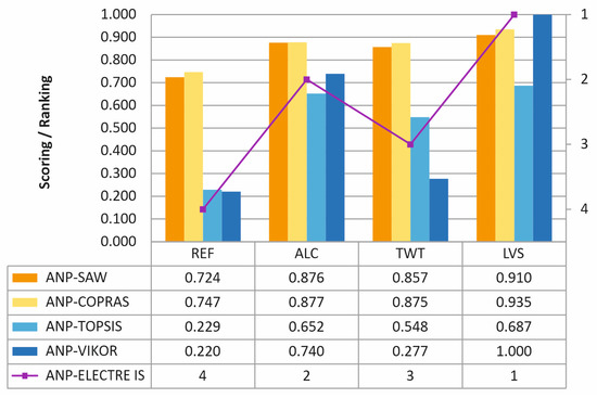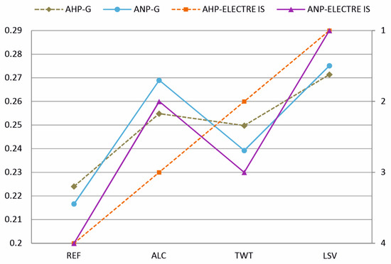 The last part of the methodology consists of aggregating the one-dimensional life cycle performance results to evaluate each alternative from a three-dimensional approach to sustainability that allows ranking them in order of preference. In addition to the ranking obtained with the pairwise comparison MCDM methods, the criteria weights obtained by AHP and ANP are combined with an outranking MCDM method to compare the results.