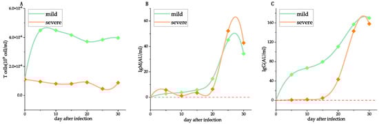 We used the cube spline interpolation method to smooth , , and data, and data with values of less than 0 were expressed as 0. The change in T cells was relatively stable. At the same time, the results from mild patients were obviously higher than those from the severe patients. The amount of antibodies will change significantly after two weeks, as shown in the Figure 2.
