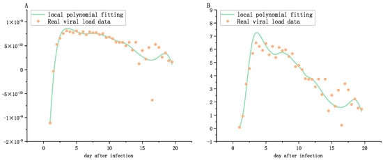 Fitting viral load data using local polynomial estimation. (A) Unit: copies/mL; (B) Unit: (copies/mL).