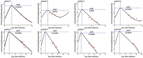 Dynamic changes in eight patients’ viral loads: patients 1, 2, 3, and 4 are mild disease patients; patients 5, 6, 7, and 8 are severe disease patients. The peak viral load of mild patients (11.24, 8.97, 9.39, 10.11) is greater than that of severe patients (12.22, 12.16, 11.64, 12.39), and the viral load of mild patients peaks earlier than that of severe patients.