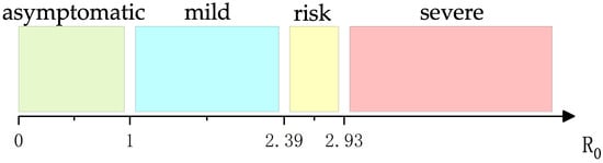 Classification of patients based on basic reproduction number. If , the patient is asymptomatic. If 1 ≤, the patient is mild. If 2.39 , the patient is at risk of becoming severe. If , the patient is severe. Patients at risk of mild to severe disease should be focused on.