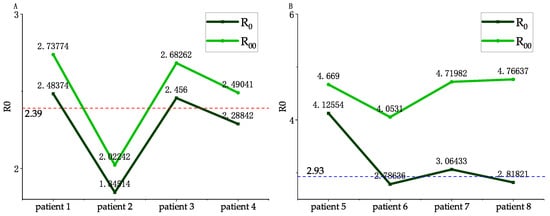 According to the patient classification given in this paper (Figure 6), when the roles of the T cells and antibodies are lost, patient 4 changes from a mild disease to an at-risk patient (Figure 7A), and the corresponding medical treatment is required; patients 6 and 8 are converted from at-risk patients to severe disease patients (Figure 7B). The non-immune basic reproduction number () in all patients increases, and the growth rate in severe disease patients is greater ( − ). This suggests that patients with severe disease are more dependent on their immune capacity, although their immune capacity is relatively more unstable.