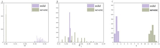 Bootstrap sampling distribution of Model 2 parameters: (A) ; (B) ; (C) ; The kurtosis of , , of severe patients is −0.61, −0.42, and −0.41; the kurtosis of mild patients is −0.29, 0.062, and 10.95. The distribution of each parameter was found to be significantly different between patients with mild and severe disease using the Mann–Whitney test (p-value ).