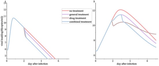 Changes in the viral load without treatment and following general treatment, drug treatment, and combined treatment: (A) mild patients (combined treatment refers to general treatment and drug treatment starting the day after infection); (B) severe patients (combined treatment refers to general treatment starting the day after infection and drug treatment starting the third day after infection).